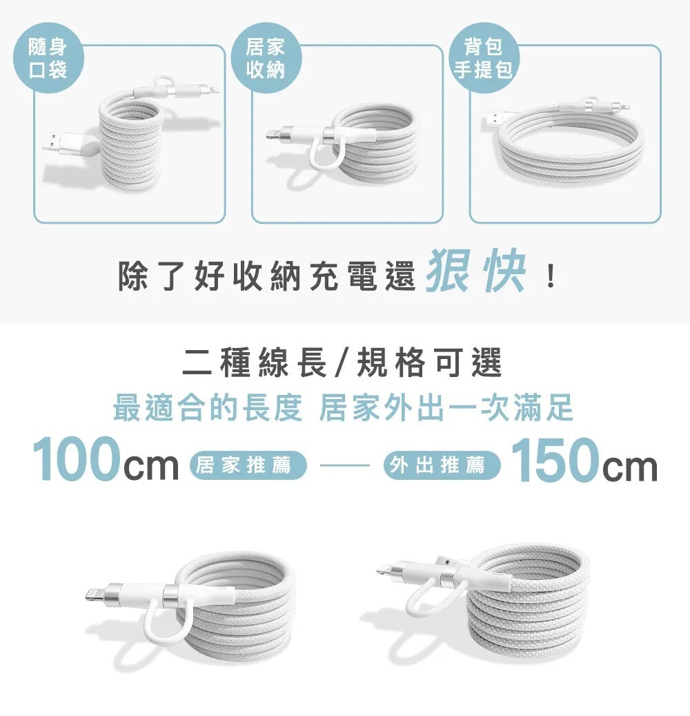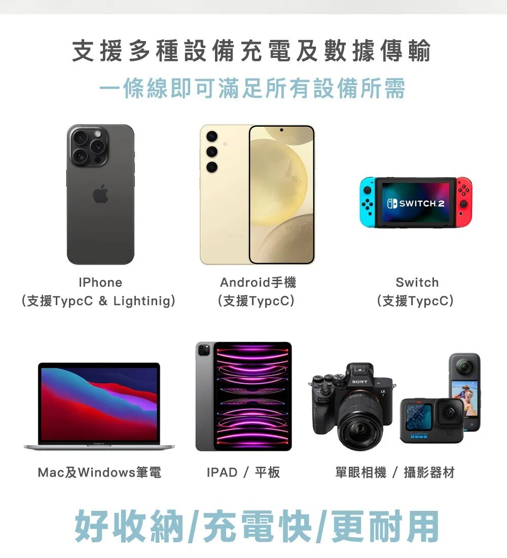 ✔️ 雙頭自由切換,適用超過百種以上設備,同時支援充電、傳輸,一線多用!