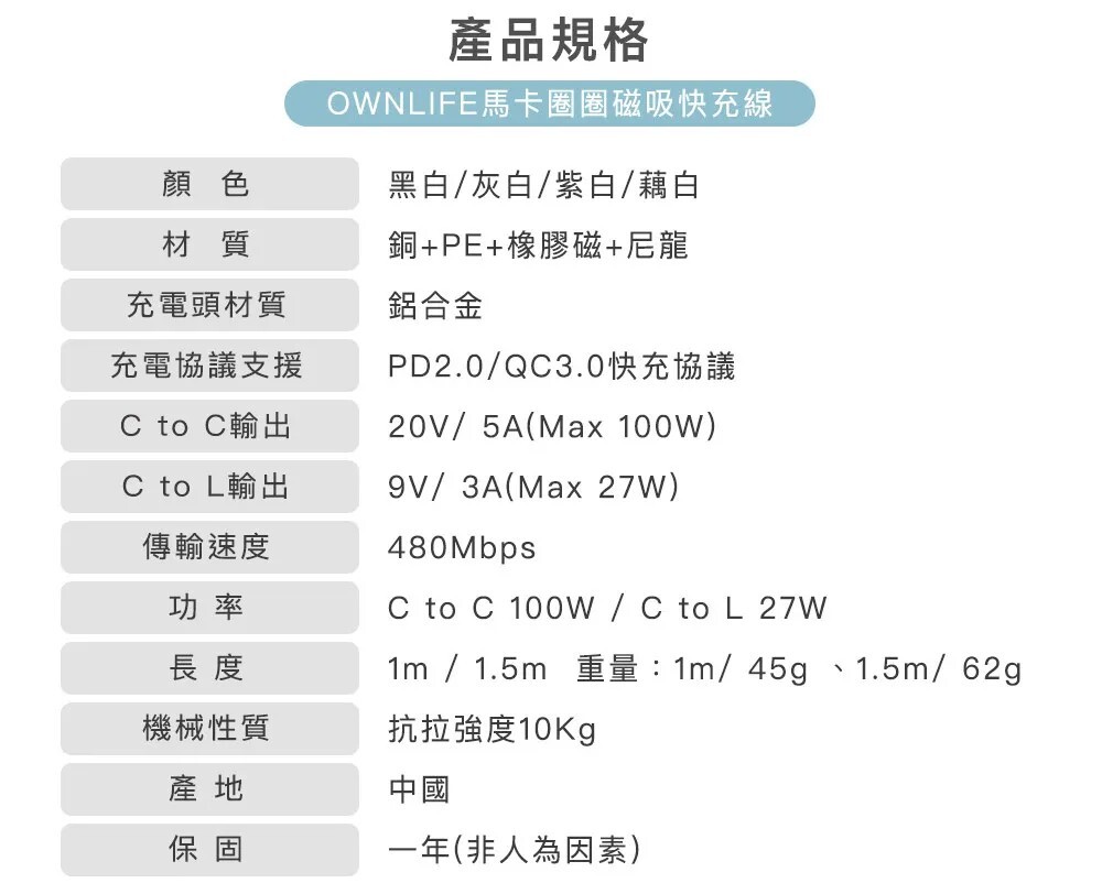 Type-C to Lightning 输入輸出: 9V⎓2.22A 12V⎓1.67A 9V⎓3A 27W 總長度 : 1.0 M/1.5 M